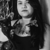 (1993, Floresta, PE) é uma artista visual e ativista brasileira originária do Povo Tuxá de Rodelas, no sertão baiano. Sua prática artística é multidisciplinar e abrange escrita, pintura, ilustração, muralismo, escultura e outras experimentações. A sua poética, seja através da palavra escrita ou da imagem, costura um elo entre a memória, a ficção e o desejo.